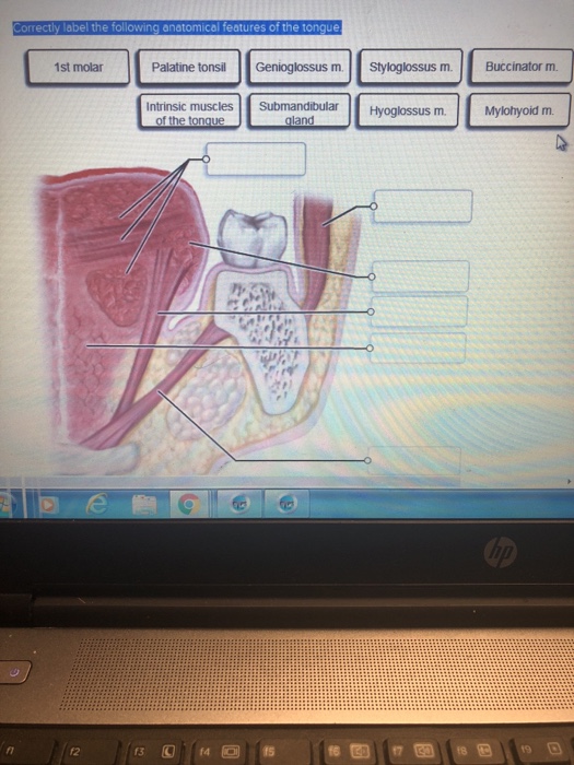 Correctly label the following anatomical features of the tongue ... Correctly label the following anatomical features of the tongue. Palatine tonsil Submandibular gland 1st molar Styloglossus m. Hyoglossus m. W Genioglossus m. Buccinator m. 10 Mylohyoid m Intrinsic muscl of the tongue Reply below - must be Registered Hold software providers accountable! *READ COMMENTS TO FIND SOLUTIONS.