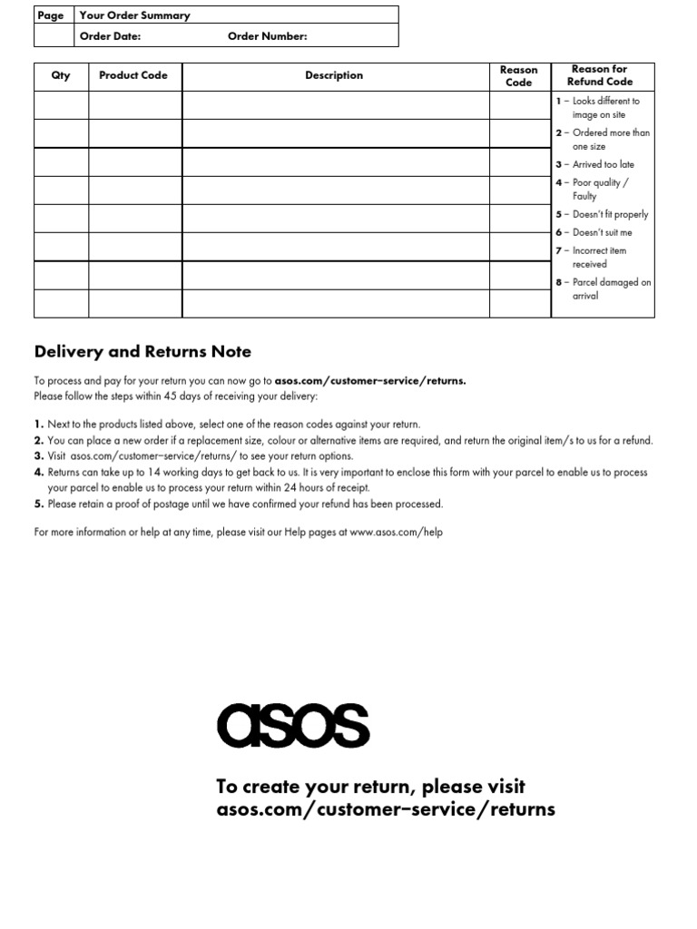 Easy-Breezy Ways To Request an ASOS Refund [Top Hacks] List the products you bought. Choose one of the reason codes offered and write it down. Take the printed label from the returns note and attach it to your return package. Make sure you attach the form to the parcel. Send the package via your local UPS. Keep the proof of postage. Wait for the confirmation email.
