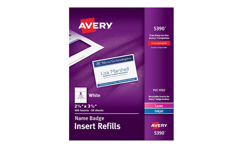 AVERY 5390 Name Tag Refills,PK50 | eBay Avery Name Badge Inserts 5390 Print or Write 2¼ x 3½" 320 Cardstock Refills $12.50 + $7.53 shipping Avery 5390 Laser/Inkjet Insert Refills ID Cards, 2 1/4" x 3 1/2",White, 400/Pack $14.20 $14.955% off Free shipping Seller 100% positive Avery Durable White Cover Up ID Labels for Laser Printers, 0.625 x 3 , Pack of $252.00 Free shipping
