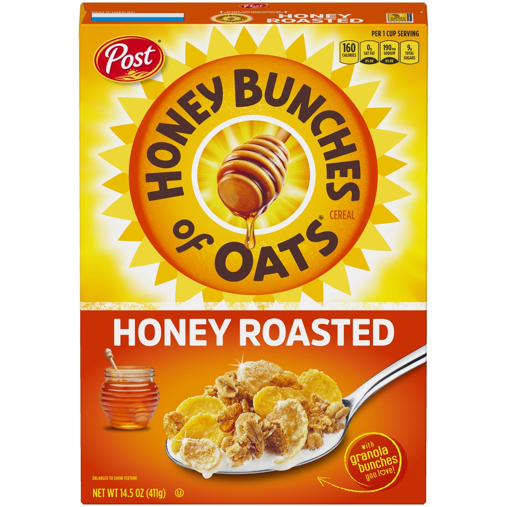 Honey Bunches of Oats with Almonds | Post Consumer Brands Canada Available in 340g, 1.2kg, and 1.4kg boxes. A bowl of Honey Bunches of Oats® can turn almost anyone into a morning person. The crispy flakes and crunchy oat bunches you love - plus sliced almonds for a satisfying breakfast. Nutrition Facts.
