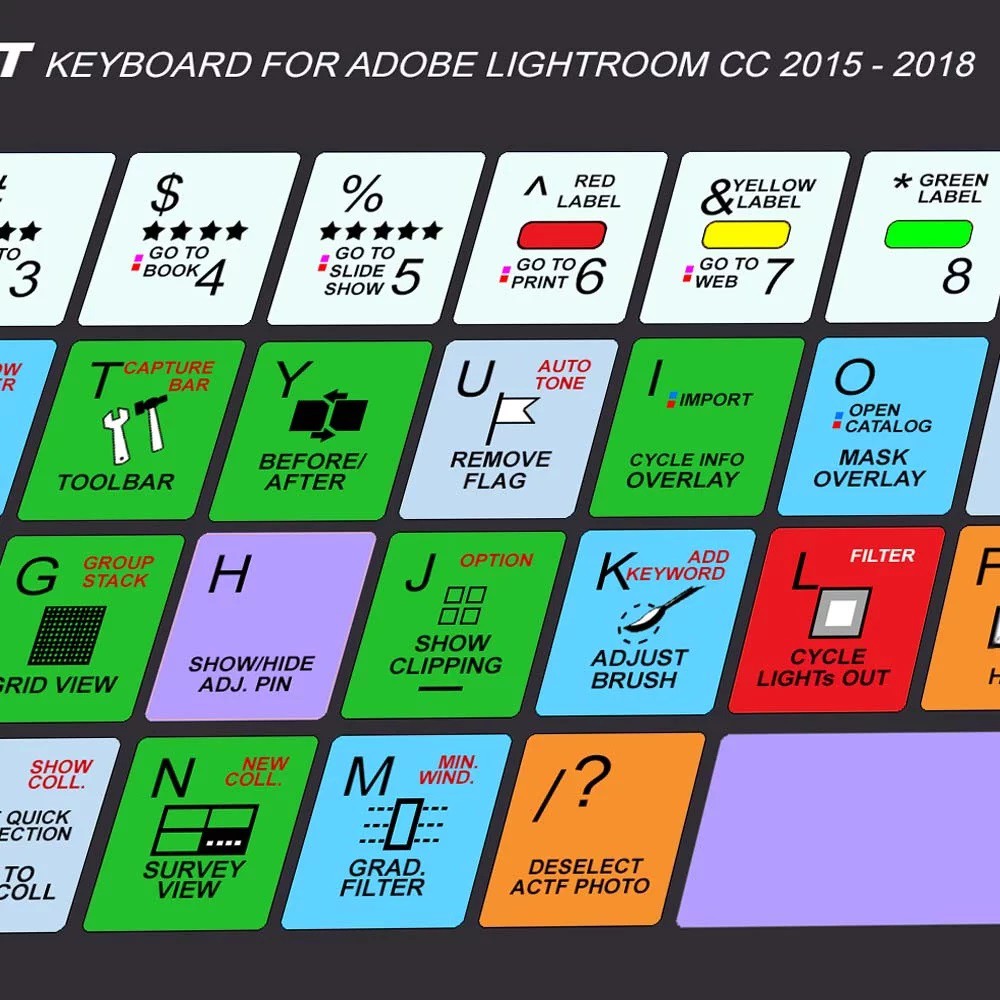 20 Essential Keyboard Shortcuts for Adobe Lightroom | Domestika The 10 best shortcuts to organize your workspace. - Import photos: Ctrl + Shift + I (Windows), Cmd + Shift + I (Mac) A quick way to access the import tool. - Compare photos: C. This shortcut opens the tool to compare two photos, side by side, and appreciate the differences between them. - Zoom: Z. To zoom in or out of photographs. Lightroom 5 Keyboard Shortcuts | The Lightroom Queen Alt (Windows) / Opt (Mac)—Changes the use of some controls. For example, in Quick Develop, it swaps the 'Clarity' and 'Vibrance' buttons for 'Sharpening' and 'Saturation.' In Develop panels, it changes the panel label to a panel 'Reset' button, and holding it down while moving some sliders shows masks or clipping warnings. Keyboard shortcuts for Lightroom Classic - Adobe Inc. Lightroom Classic keyboard shortcuts Keys for working with panels Keys for navigating modules Keys for changing views and screen modes Keys for using a secondary window Note: The shortcuts for using the secondary window are the same as the equivalent shortcuts in the Library module, with the Shift key added. Keys for managing photos and catalogs Must Know 20 Shortcuts Key For Lightroom - clippingpathexperts.com Color Label Shortcut: 6-9. While 1-5 buttons of the keyboard helps you to assign rating to the images, 6-9 buttons of the keyboard helps you to put color labels such as red, yellow, green and blue to the photos. The color labels will help you to categorize different image folders by the colors.