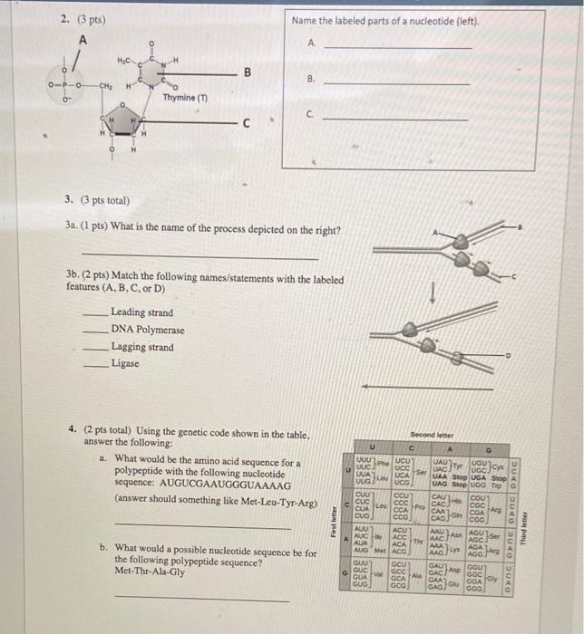 Solved Name the labeled parts of a nucleotide (left). 2. (3 | Chegg.com Name the labeled parts of a nucleotide (left). 2. (3 pts) A A O < B B. CHE Opo 0- Thymine (1) C. с 3. (3 pts total) 3a. (1 pts) What is the name of the process depicted on the right? 3b. (2 pts) Match the following names/statements with the labeled features (A, B, C, or D) Leading strand DNA Polymerase Lagging strand Ligase UUU prve ) 4.