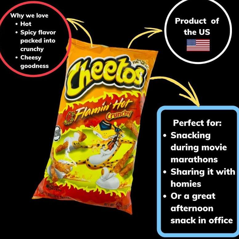 CHEETOS® Crunchy FLAMIN' HOT® Cheese Flavored Snacks | Cheetos CHEETOS ® Crunchy FLAMIN' HOT ® Cheese Flavored Snacks 4.0 (8) Write a review Description Hot, spicy flavor packed into crunchy, cheesy snacks. CHEETOS ® Crunchy FLAMIN' HOT ® Cheese Flavored Snacks are full of flavor and made with real cheese. Nutrition Facts Ingredients Buy Now Buy Now