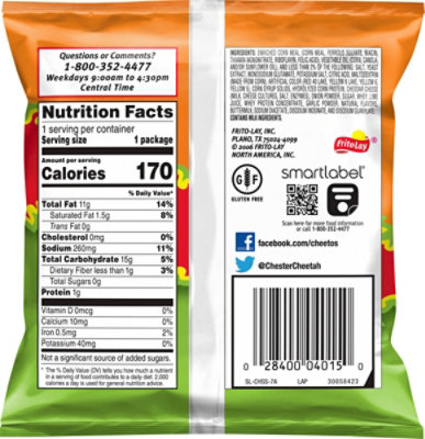 CHEETOS® Crunchy Cheese Flavored Snacks | Cheetos WebHowever, we recommend that you check the label on a specific product for the most current and accurate nutritional information. If you need assistance, please contact Consumer Relations toll-free at 1-800-352-4477 Monday through Friday between 9:00 a.m. and 4:30 p.m. Central Standard Time. › products › cheetos-puffs-flaminCHEETOS® Puffs FLAMIN' HOT® Cheese Flavored Snacks | Cheetos However, we recommend that you check the label on a specific product for the most current and accurate nutritional information. If you need assistance, please contact Consumer Relations toll-free at 1-800-352-4477 Monday through Friday between 9:00 a.m. and 4:30 p.m. Central Standard Time. › products › cheetos-crunchy-cheeseCHEETOS® Crunchy Cheese Flavored Snacks | Cheetos However, we recommend that you check the label on a specific product for the most current and accurate nutritional information. If you need assistance, please contact Consumer Relations toll-free at 1-800-352-4477 Monday through Friday between 9:00 a.m. and 4:30 p.m. Central Standard Time.