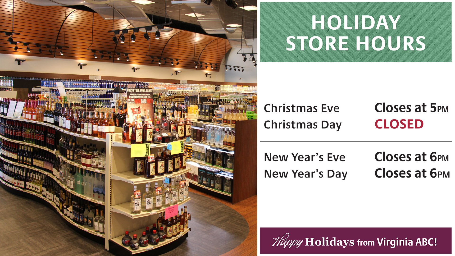 › storesStores - Virginia PLEASE NOTE: Virginia ABC stores will close at 6 p.m on New Year's Eve (12/31) and New Year's Day (1/1).
