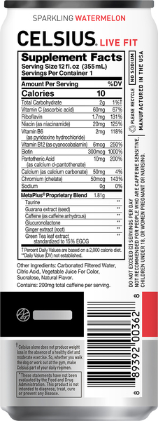 Sparkling Watermelon - Celsius Sparkling Watermelon. Need an afternoon pick-me-up? Re-focus on your goals and recharge your energy with CELSIUS Sparkling Watermelon! Made with clinically proven ingredients, this carbonated flavor of CELSIUS has the perfect balance of flavor and energy that serves as an awesome pick-me-up for active lifestyles.