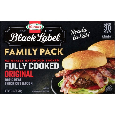 Hormel Black Label Fully Cooked Thick Cut Bacon - Instacart Get Hormel Black Label Fully Cooked Thick Cut Bacon delivered to you in as fast as 1 hour via Instacart or choose curbside or in-store pickup. Contactless delivery and your first delivery or pickup order is free! Start shopping online now with Instacart to get your favorite products on-demand. HORMEL BLACK LABEL Bacon, Fully Cooked, 2.52 oz - Walmart.com At 5 g of protein and 70 calories per serving, you can make bacon the star ingredient in all your meals. Contains one 2.52 oz. package of HORMEL BLACK LABEL Fully Cooked Bacon. For more than 100 years, we've led the craze and pushed bacon forward. HORMEL BLACK LABEL Bacon is serious bacon for serious bacon lovers — or anyone ready to become ...