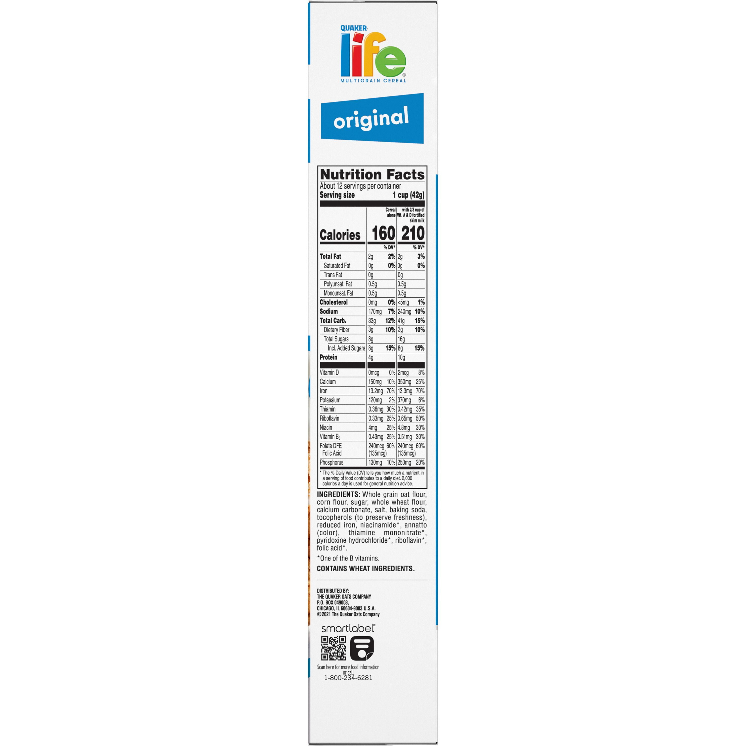 Is Life Cereal Healthy? Nutritional Label, Facts - HealthReporter Dec 29, 2022 · In terms of vitamins and minerals, Life cereal also contains calcium, iron, niacin (vitamin B3), thiamine (vitamin B1), pyridoxine (vitamin B6), riboflavin (vitamin B2), and folic acid (vitamin B9). For processing and preservation, Life cereal also contains salt, baking soda, tocopherols (to preserve freshness), and annatto for color. Life Cereal: Original | Quaker Oats Product Details Heart Healthy* *Diets rich in whole grain foods and other plant foods and low in total fat, saturated fat and cholesterol may reduce the risk of heart disease. 26g of Whole Grains per serving Excellent Source of 5 B Vitamins No Artificial Preservatives Good Source of calcium No artificial flavors No colors from artificial sources