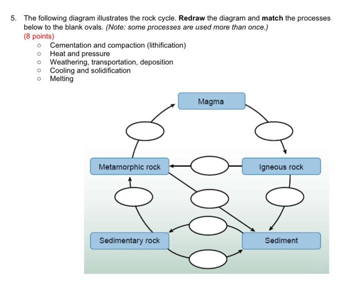 Rock Cycle Diagram - Science Struck The diagram of a rock cycle represents the conversion of rocks that are found on the Earth's surface from one form to another. These different kinds of rocks are intermittently connected to each other and follow this cycle on a regular basis, though each step takes hundreds of years to complete. The Rock Cycle Worksheets - Math Worksheets 4 Kids Rock Cycle Process Diagram A perfect combo of rocks and steps involved in the rock cycle, this printable rock cycle process diagram introduces 5th grade kids to processes like weathering and erosion and the three types of rocks. Identifying and Naming the Types of Rocks THE ROCK CYCLE - geolsoc.org.uk Basalt and granite rock samples (optional) bank below to label the different processes and rock types in the rock cycle. Burial & compaction Deposition of sediments Erosion & transport Weathering Melting Crystallisation of magma Metamorphic rock Sedimentary rock Igneous rock Uplift Metamorphosis